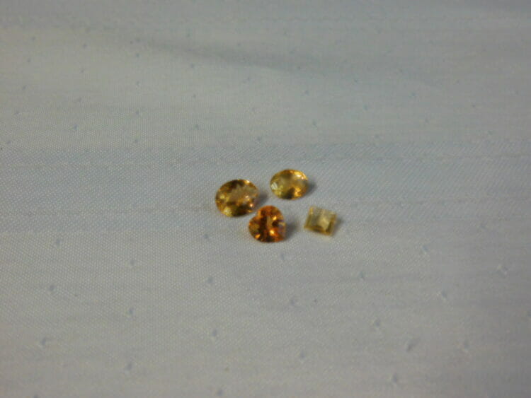 qty 4 Citrine quartz gemstones: total weight 10ct.; (1) 9x7mm oval cut, (1) 10×8 oval cut, (1) 8x8mm heart cut & (1) 6x6mm square cut