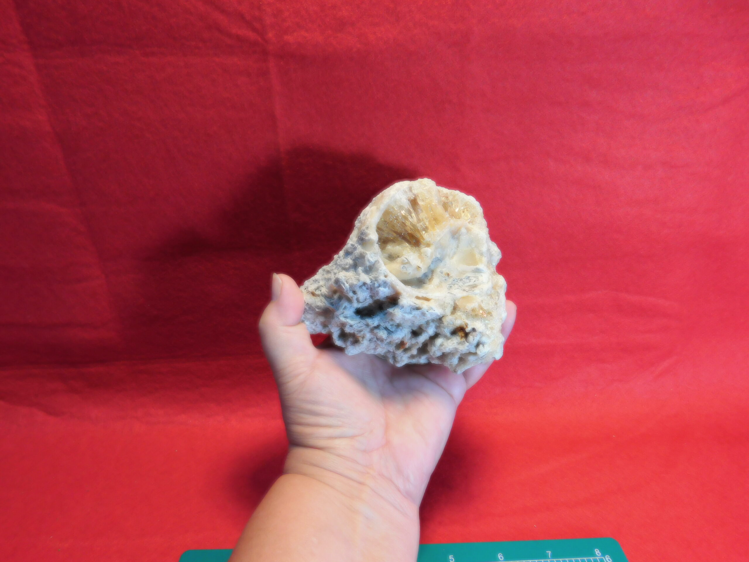 Calcified Fossil Shell: Busycon carica knobbed Welk Pleistocene Era, Florida. Beautiful honey calcite crystals have filled or replaced shell material during fossilization. These shells are UNIQUE; from the Early Pleistocene, up to 2.6 million years old allowing the shell to become completely filled or replaced by calcite crystals. ***This piece is composed of a couple of shells melded together. FLUORESCENT YELLOW and PHOSPHORESCENT GREEN under UV light. The camera photos are NOT ACCURATE UV COLORS as the Filters changes the calcite yellow to BLUE. YOU will SEE THE CALCITE UNDER UV as a LIGHT YELLOW GLOW. Collected in east Orlando FL by one person years prior to Rucks Pit opening. There are many specimens available. The Material has been cleaned and excess trimmed but not enhanced. You will receive the specimen pictured. The specimen will be shedding sand, matrix, calcite etc… This is normal and unavoidable. A specimen information card is included. PS there is no fossil certification on these as posted on other sellers sites, this is a seller generated advertising gimmick. Calcified shells cannot be faked.